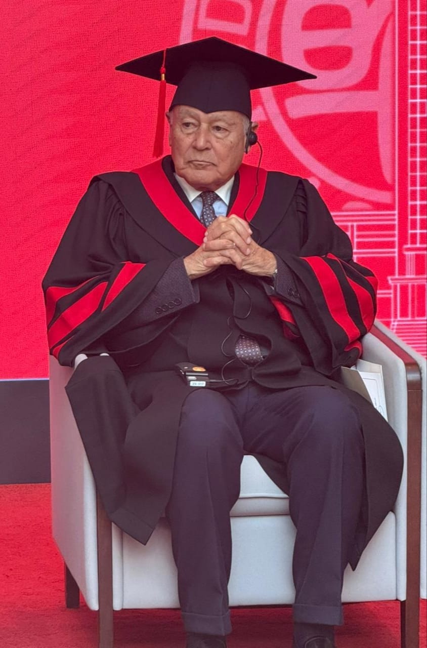 وأشهد هذه اللحظة التاريخية بمنحي درجة الدكتوراه الفخرية من جامعة فودان، هذا التكريم لا أعتبره تكريماً شخصياً فقط بل هو تقدير لكل ما تمثله جامعة الدول العربية "بيت العرب" من قيم العمل المشترك التي تعتبر جسراً للتواصل الحضاري والإنساني بين شعوبنا، وخدمة قضايا أمتنا العربية، وداعماً للتعاون مع مختلف دول العالم.
