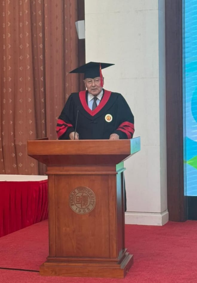 في الختام، أود أن أشكر جامعة فودان وأساتذتها وطلابها، وأشكر الشعب الصيني الصديق على هذا التكريم الذي سيبقى علامة مضيئة في مسيرتي العملية.