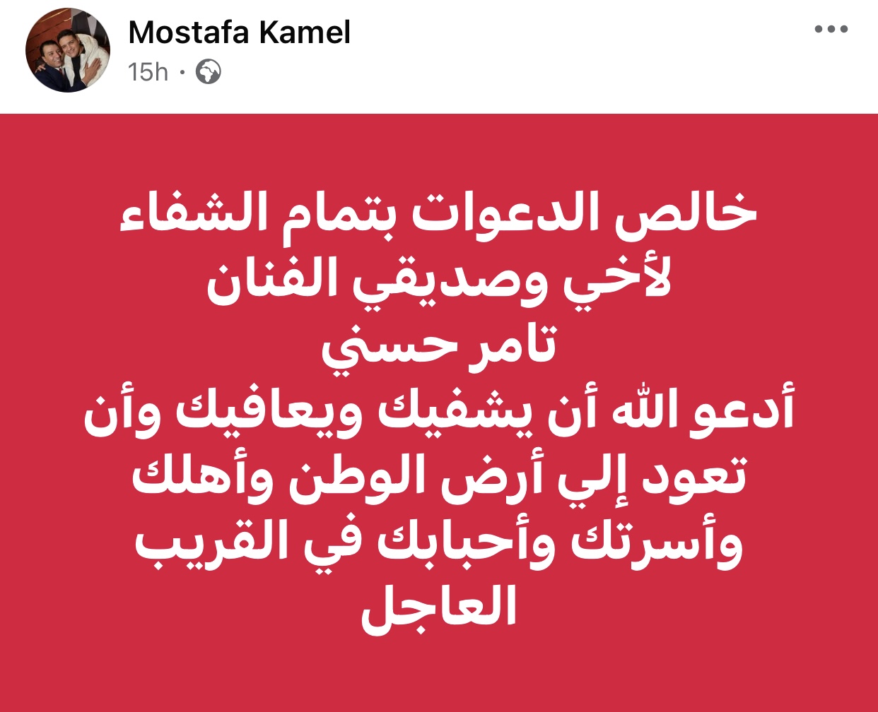وكتب مصطفى كامل على حسابه الشخصي بموقع فيسبوك: “خالص الدعوات بتمام الشفاء لأخي وصديقي الفنان تامر حسني، أدعو اللّٰه أن يشفيك ويعافيك وأن تعود إلي أرض الوطن وأهلك وأسرتك وأحبابك في القريب العاجل”.
