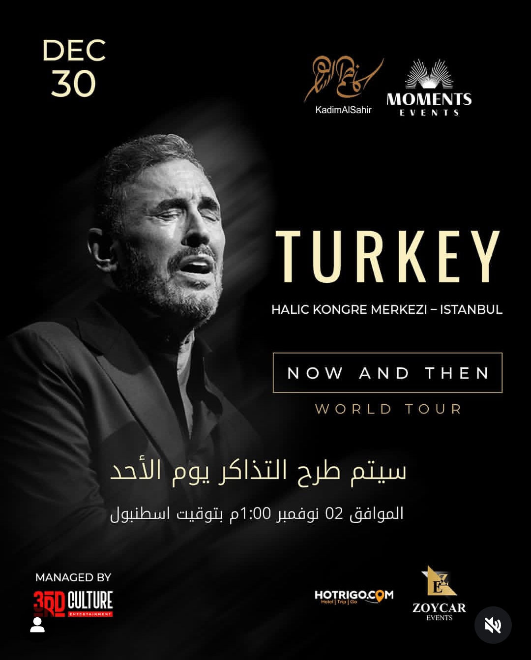 طرحت الشركة المنظمة لحفل الفنان كاظم الساهر، المرتقب في مدينة إسطنبول التركية، تذاكر الحفل للحجز الإلكتروني للجمهور.