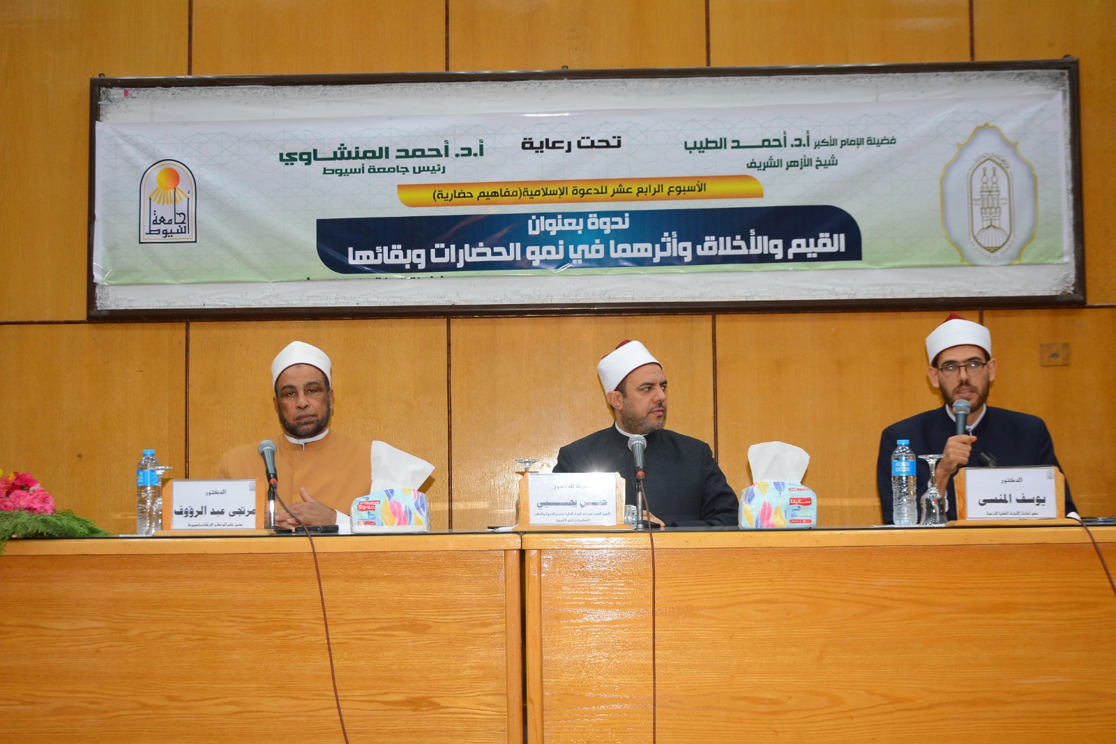 استضافت كلية الآداب بجامعة أسيوط ندوة موسّعة بعنوان "القِيَم والأخلاق وأثرها في نموِّ الحضارات"، وذلك ضمن فعاليات الأسبوع الرابع عشر للدعوة الإسلامية، الذي يُعقد تحت رعاية الدكتور أحمد المنشاوي رئيس الجامعة، وتنظمه اللجنة العليا للدعوة بمجمع البحوث الإسلامية بالتعاون مع الجامعة تحت شعار "مفاهيم حضارية"، وتحت رعاية فضيلة الإمام الأكبر الدكتور أحمد الطيب شيخ الأزهر الشريف، وبإشراف فضيلة الدكتور محمد الضويني وكيل الأزهر.