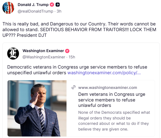 في تصعيد لاذع في الخطاب السياسي الأمريكي، هاجم الرئيس دونالد ترامب عدداً من المشرّعين الديمقراطيين، ودعا إلى اعتقالهم ومحاكمتهم بعد أن نشروا فيديو يحثّون فيه أعضاء الجيش والاستخبارات على رفض ما وصفوها “أوامر غير قانونية”، واصفا إياهم بأنهم منخرطون في “سلوك تحريضي على أعلى مستوى” و“خونة للوطن”.