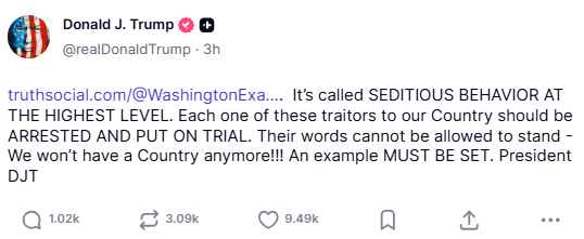 وفي تدوينة على منصته “تروث سوشيال” كتب ترامب: «لا يمكن السماح لكلماتهم أن تمر دون عقاب… يجب أن نوجّه رسالة رادعة».
