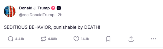 وأضاف في منشور لاحق أنه يرى في هذا “السلوك التحريضي” جريمة تستحق عقوبة الإعدام، قائلاً: «سلوك خيانة عظمى، قابل للعقاب بالإعدام».
