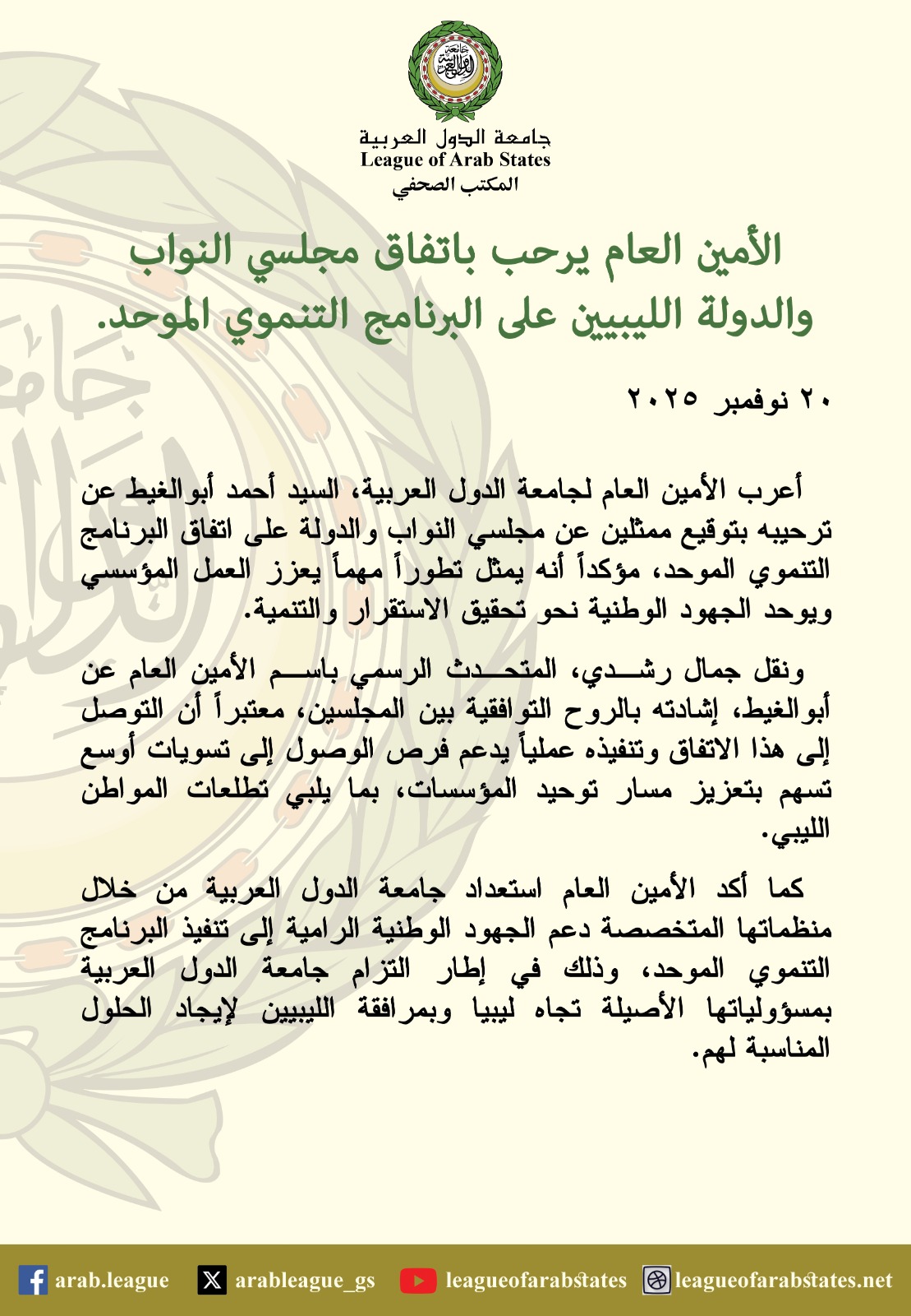 كما أكد الأمين العام استعداد جامعة الدول العربية من خلال منظماتها المتخصصة دعم الجهود الوطنية الرامية إلى تنفيذ البرنامج التنموي الموحد، وذلك في إطار التزام جامعة الدول العربية بمسؤولياتها الأصيلة تجاه ليبيا ومرافقة الليبيين لإيجاد الحلول المناسبة لهم.