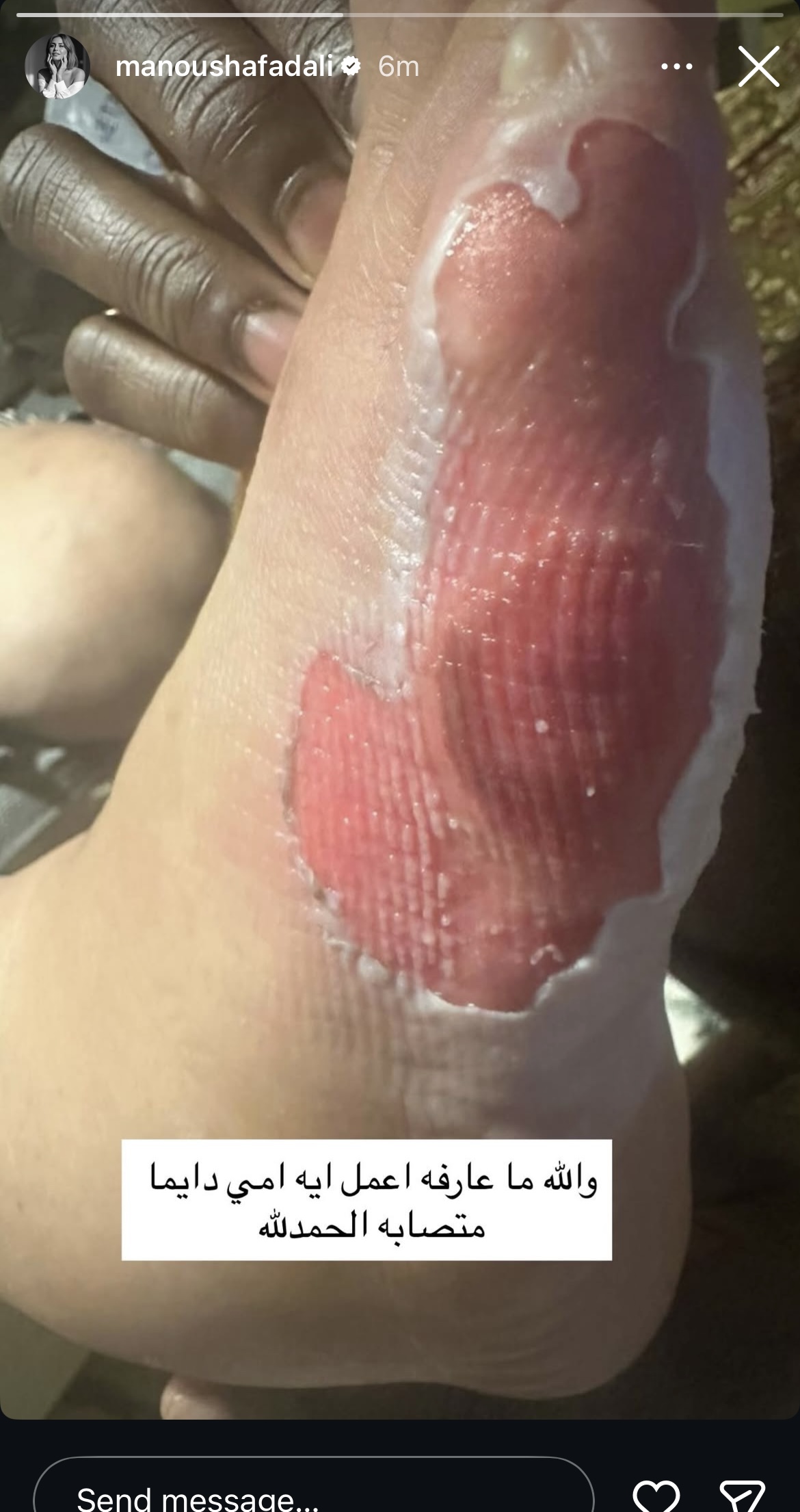 كشفت الفنانة منة فضالي، عن إصابة والدتها في القدم بجرح كبير، عبر حسابها الشخصي على موقع التواصل الاجتماعي انستجرام.