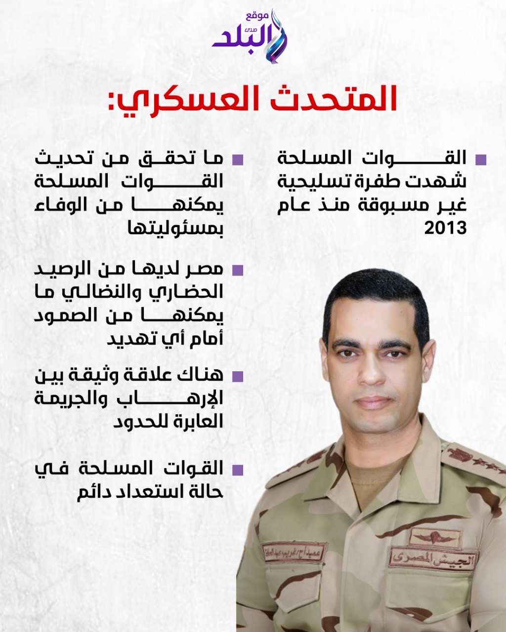 = وأوضح المتحدث العسكري أن في تصريحات له إن ما تحقق من تطوير وتحديث داخل القوات المسلحة يمكنها من الوفاء بمسئوليتها في ظل ظروف شديدة التعقيد، مشيرا أن مصر لديها من الرصيد الحضاري والنضالي ما يمكنها من الصمود أمام أي تهديد.
