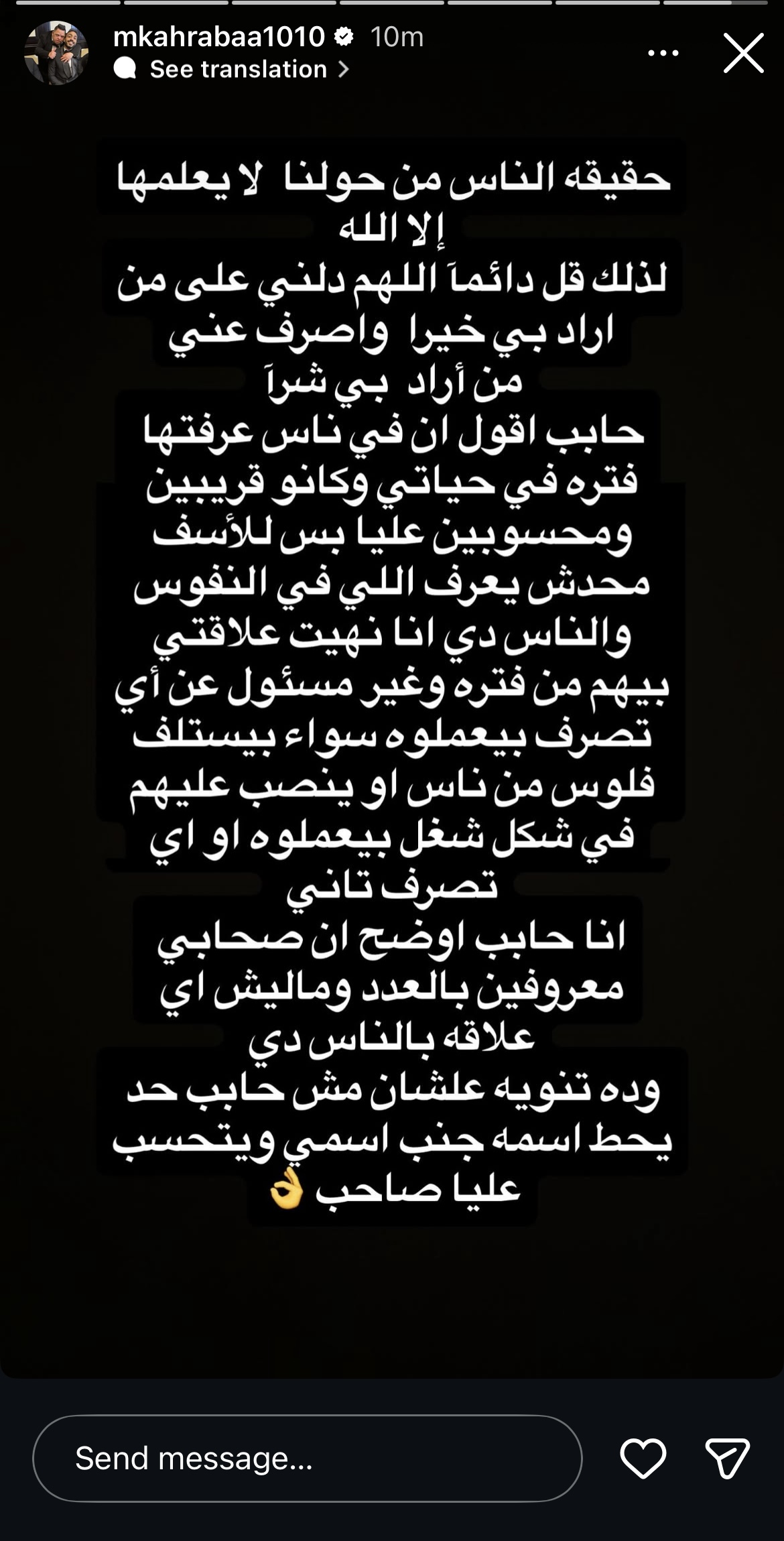 وتابع: “حابب اقول ان في ناس عرفتها في حياتي كانوا قريبين ومحسوبين عليا بس للاسف محدش يعرف اللي في النفوس والناس دي انا نهيت علاقتي بيهم من فترة وغير مسئول عن اي تصرف بيعملوه سواء بيستلف او بينصب عليهم”.
