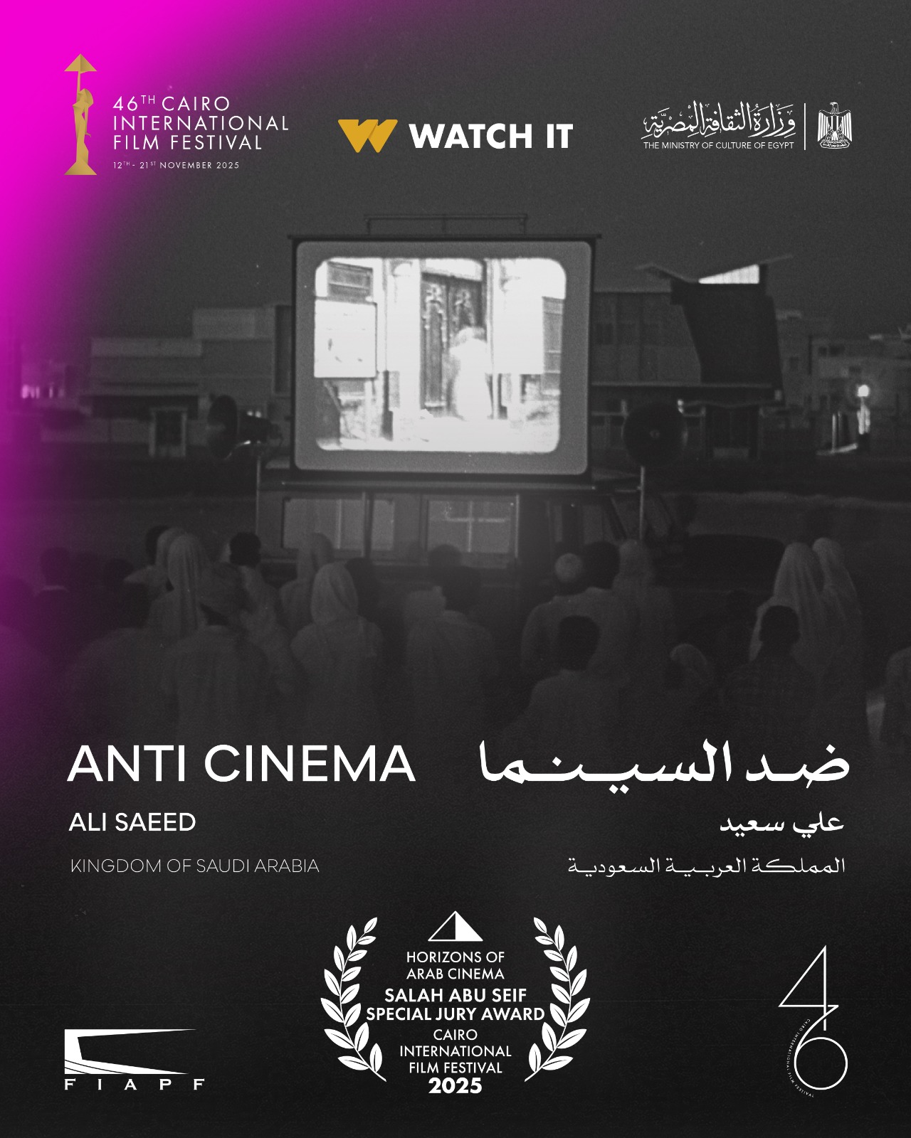 جائزة صلاح أبو سيف – جائزة لجنة التحكيم الخاصة 8000 دولار – مقدمة من Watch It لفيلم "ضد السينما" (ANTI-CINEMA) للمخرج علي سعيد.