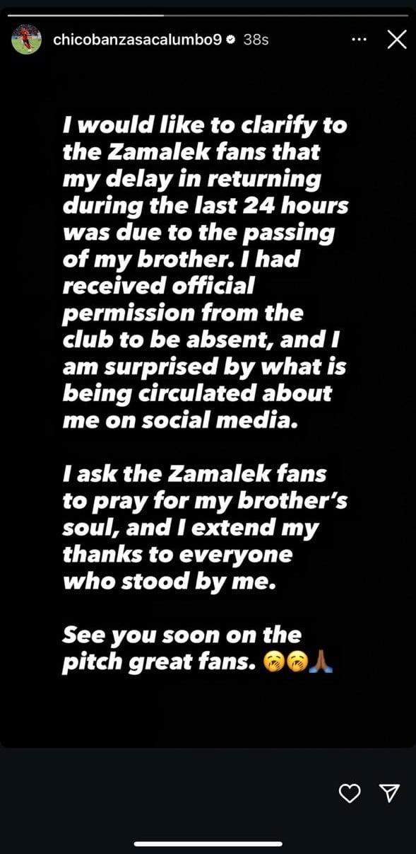 ونشر اللاعب الأنجولي عبر حسابه الشخصي على موقع "انستجرام" قائلاً:" أود أن أوضح لجماهير الزمالك أن تأخر عودتي خلال الـ 24 ساعة الماضية كان بسبب وفاة شقيقي"