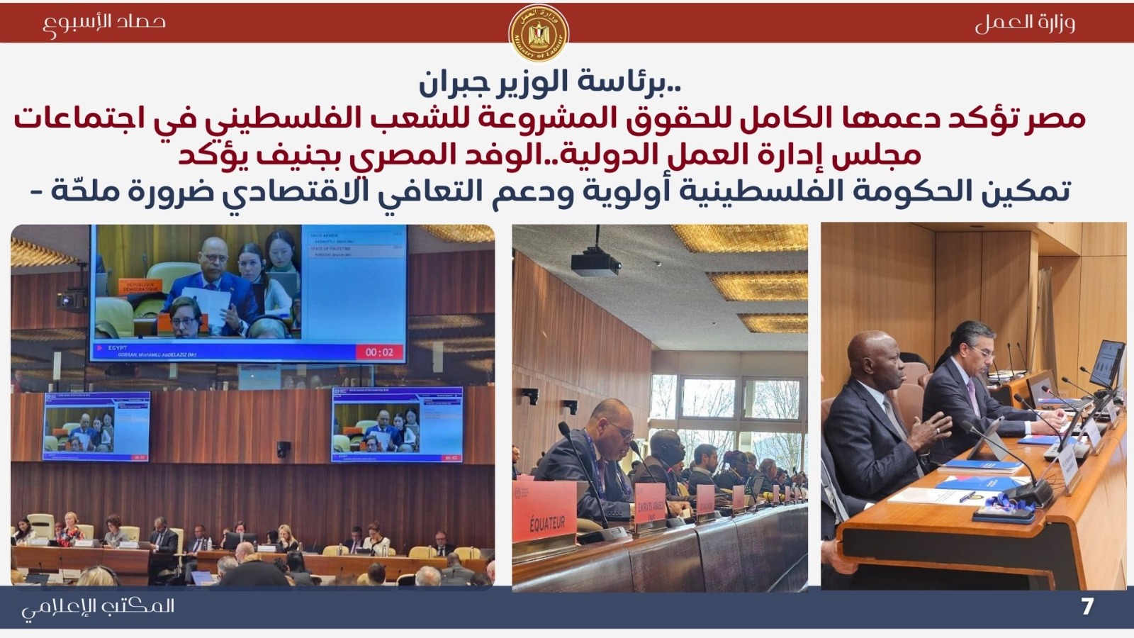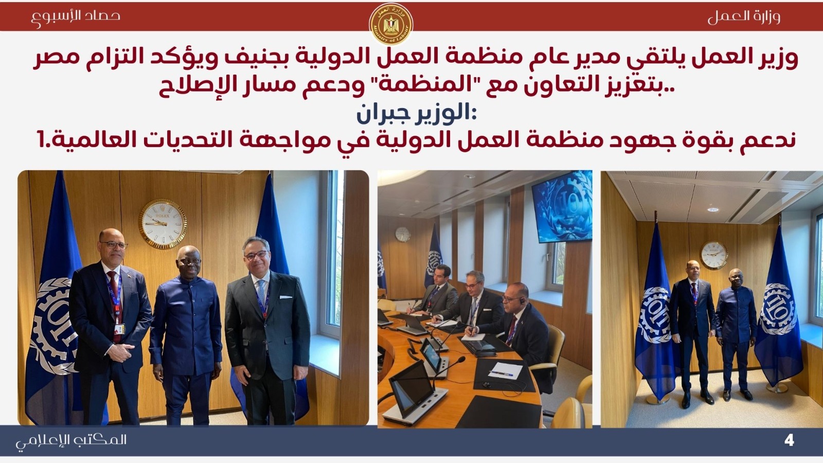 ..وترأس الوزير – بصفته رئيس مجلس إدارة منظمة العمل العربية – اجتماع المجموعة العربية، مؤكدًا أهمية التكامل العربي والتنسيق المشترك، ودعم القضايا العمالية العربية، وعلى رأسها دعم العمالة الفلسطينية وتعزيز التعاون العربي الدولي.