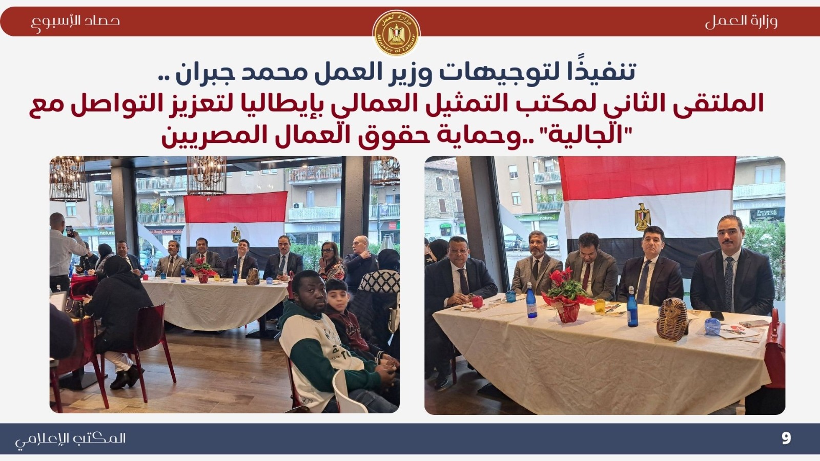 نظم مكتب التمثيل العمالي في إيطاليا ملتقى موسعًا للجالية المصرية، لتعريفهم بحقوقهم وآليات الدعم، وتعزيز سبل الاستفادة من نظم التأمين والمعاشات الإيطالية.