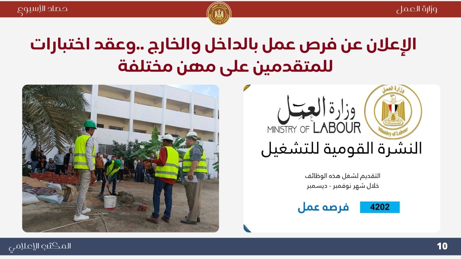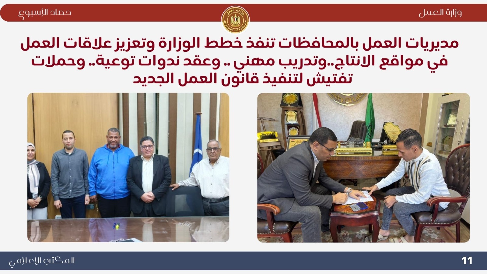 ..وفي الختام تؤكد وزارة العمل استمرارها في تنفيذ استراتيجية الدولة لبناء سوق عمل مستقر، وتعزيز الحوار الاجتماعي، وحماية حقوق العمال، وتوفير فرص العمل اللائق، بما يحقق التنمية المستدامة ورؤية مصر المستقبلية.