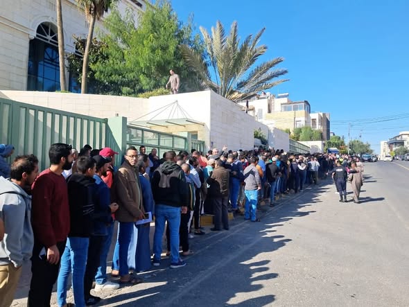 يتوافد أبناء الجالية المصرية في الأردن، على مقر السفارة المصرية في عمان، للإدلاء بأصواتهم في اليوم الثاني لعملية تصويت المصريين في الخارج ضمن المرحلة الثانية من انتخابات مجلس النواب 2025.
