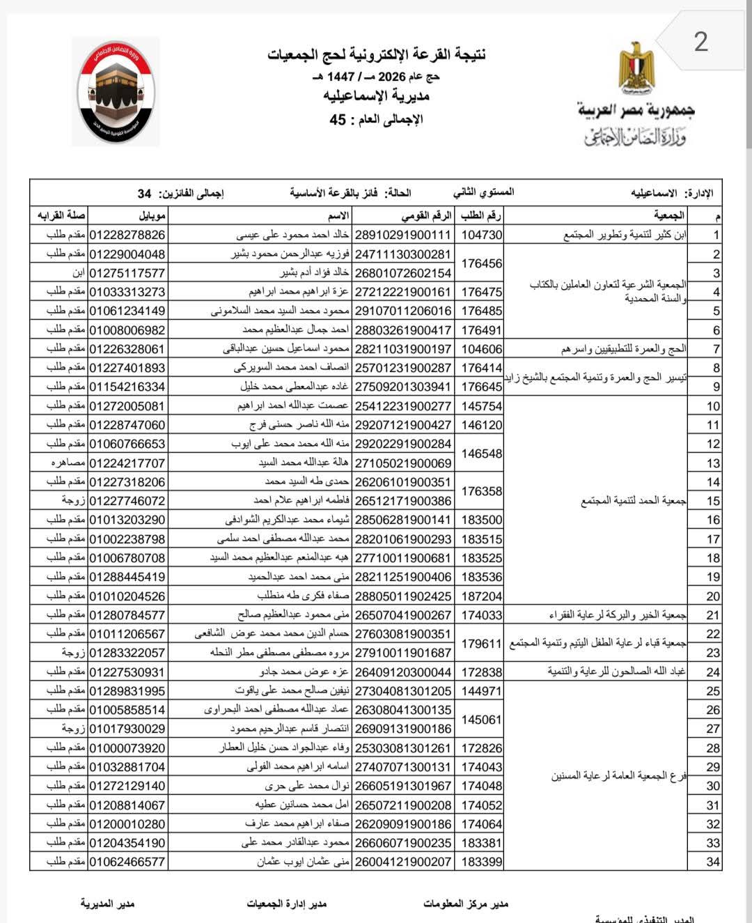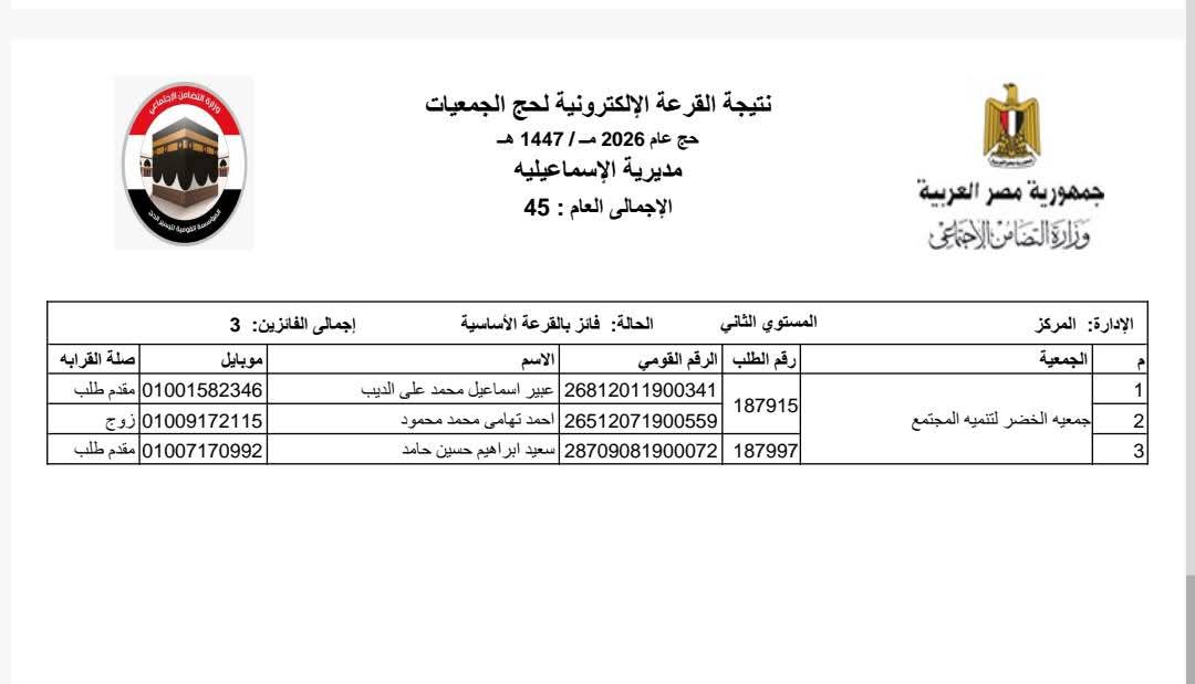 وكانت الدكتورة مايا مرسي وزيرة التضامن الاجتماعي رئيسة مجلس أمناء المؤسسة القومية لتيسير الحج، قد شهدت إجراء القرعة الإلكترونية العلنية لاختيار حجاج الجمعيات الأهلية لموسم لموسم حج ١٤٤٧هـ- ٢٠٢٦م.