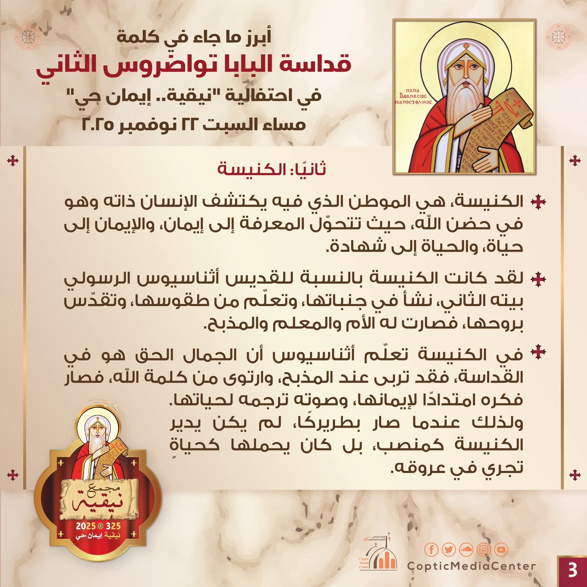 وأوضح قداسة البابا أن مجمع نيقية لم يكن حدثا عابرا، بل ميلادا لإيمان جامع للعالم كله، وكان القديس أثناسيوس صوت الوحدة والحق، وحارسا للعقيدة التي ما زلنا نعيش بها حتى الآن.