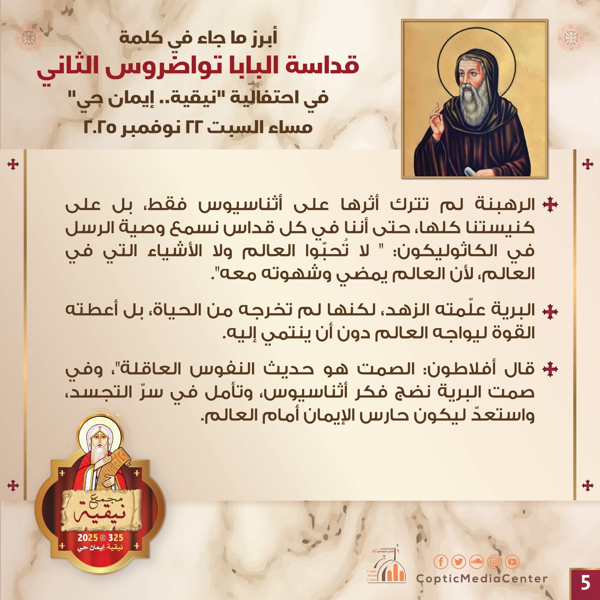 وأشار قداسته إلى أن أثناسيوس دفع ثمن الدفاع عن الإيمان غاليا، إذ نُفي خمس مرات عن كرسيه الرسولي، إلا أنه خرج من كل منفى أكثر قوة ونقاء، مستندًا إلى سيرة القديسين الكبار الذين حملوا مشعل الإيمان إلى العالم كله.