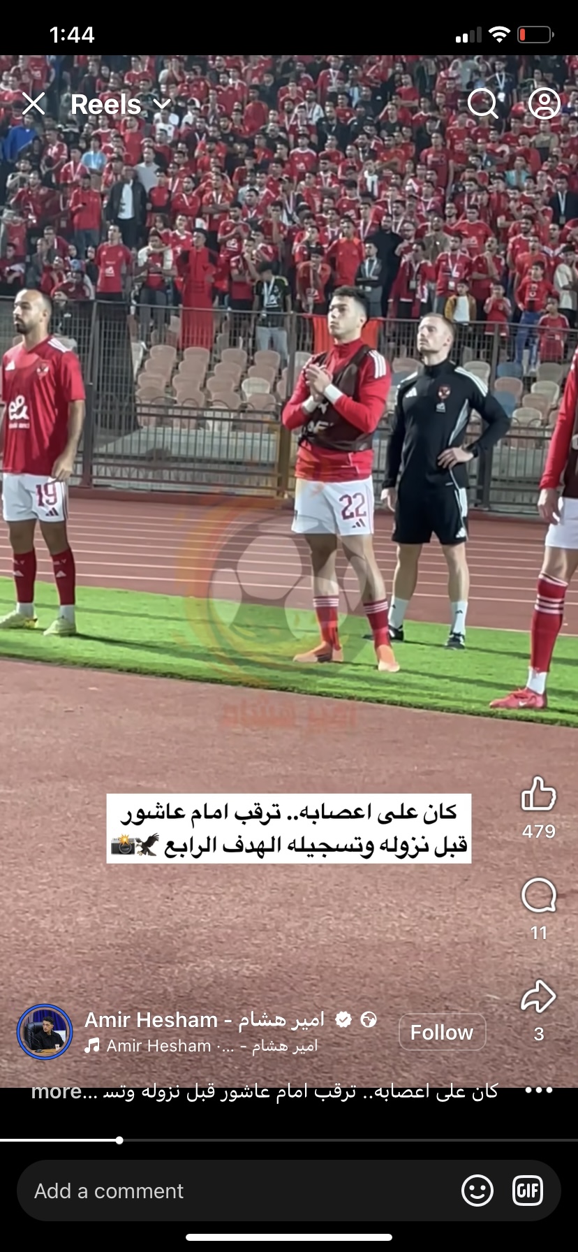 وشارك أمير هشام فيديو لعاشور عبر حسابه على موقع التواصل الاجتماعي "فيسبوك"، وعلق عليه: "كان على أعصابه.. ترقّب إمام عاشور قبل نزوله وتسجيله الهدف الرابع".