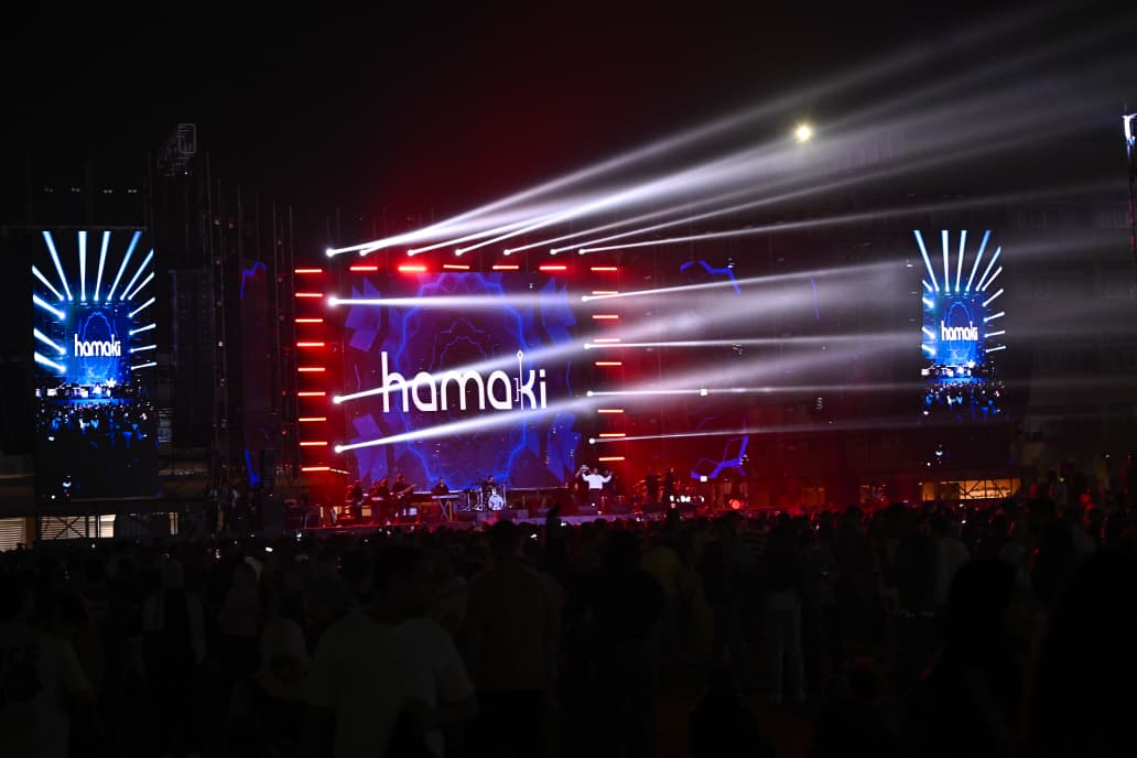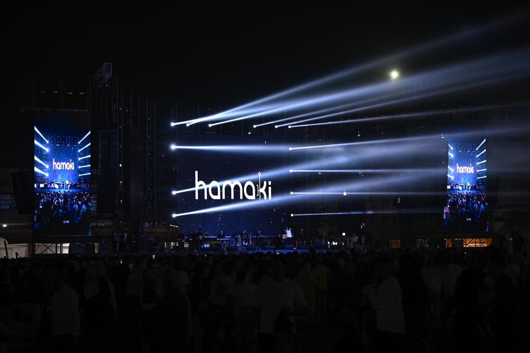 وخطف حماقي الأنظار بـ "لوك كاجوال" مميز وبمجرد صعوده على خشبة المسرح مرددا "نفسى ابقي جنبه" استقبله الطلاب بعاصفة من صيحات وهتافات الإعجاب.