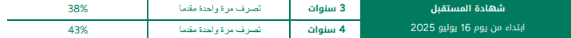 4 سنوات: 43% يُصرف فور ربط الشهادة (يعادل عائداً فعلياً سنوياً نحو 15.09%).