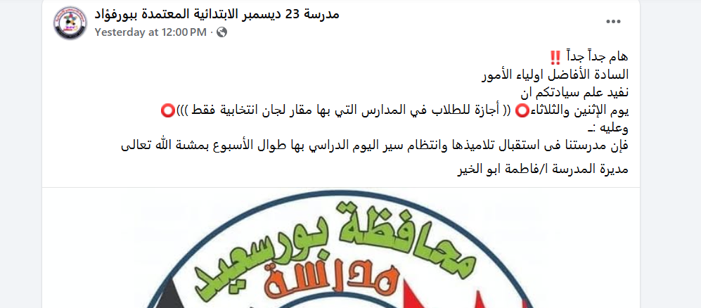 أعلنت المدارس المقرر استخدامها كلجان انتخابية في المرحلة الثانية من انتخابات مجلس النواب 2025 ، عن تعليق الدراسة ومنح الطلاب اجازة غدا الاثنين وبعد غد الثلاثاء