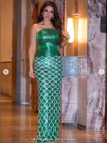 تألقت درة في الصور بإطلالة راقية، حيث ارتدت فستانا طويلا ذا أكمام مكشوفة، واتسم التصميم بالقماش الأخضر المطرز بالكامل.
