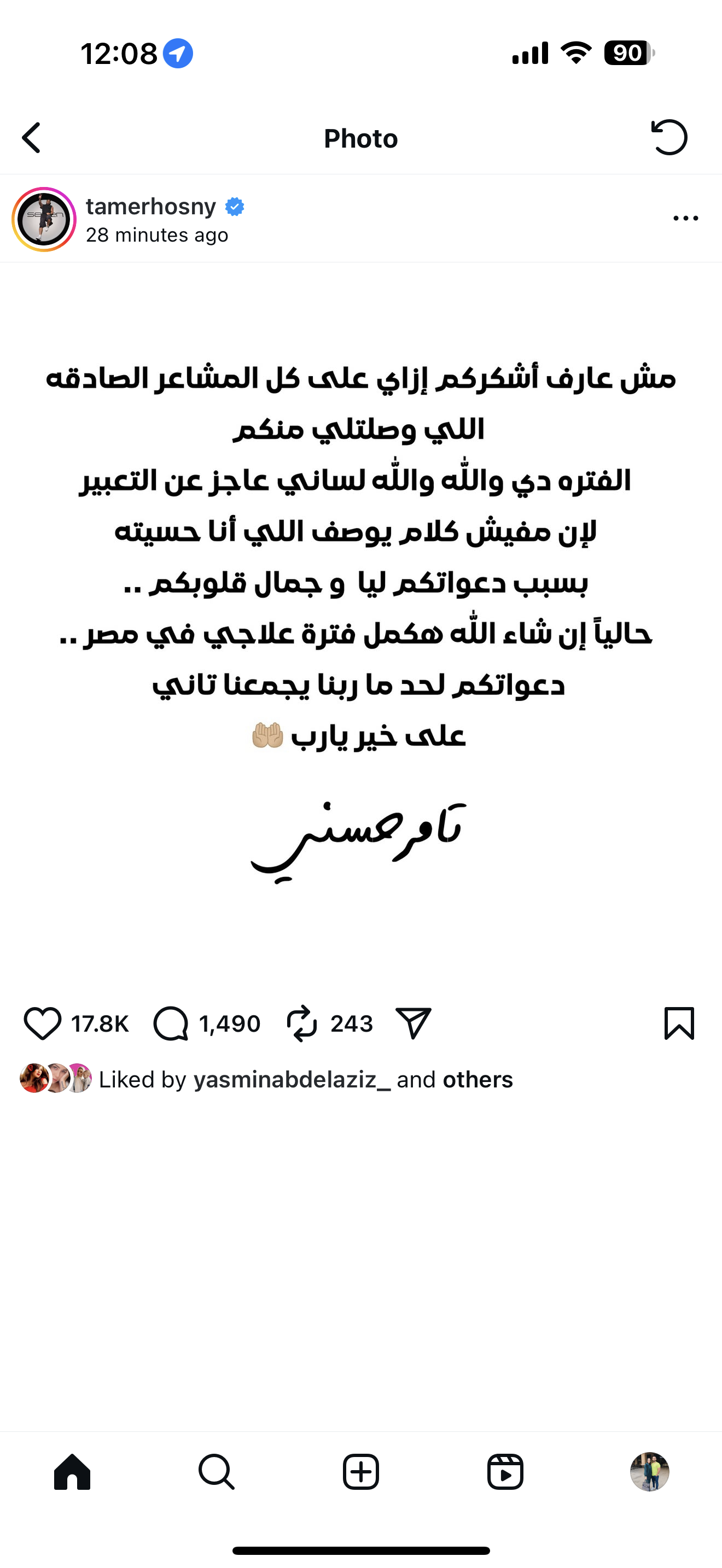 وكتب تامر حسني : "مش عارف أشكركم إزاي على كل المشاعر الصادقة اللي وصلتلي منكم الفترة دي والله والله لساني عاجز عن التعبير لأن مفيش كلام يوصف اللي أنا حسيته بسبب دعواتكم ليا و جمال قلوبكم .. حالياً إن شاء الله هكمل فترة علاجي في مصر .. دعواتكم لحد ما ربنا يجمعنا تاني على خير يا رب".