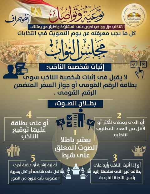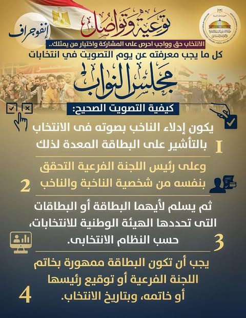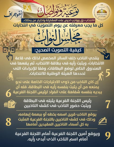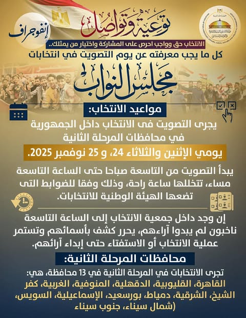 أصدرت وزارة الشؤون النيابية والقانونية والتواصل السياسي بيانًا قالت فيه إنه استمرارًا لسلسة توعية وتواصل التي تصدرها الوزارة بالتزامن مع انتخابات مجلس النواب، نشرت اليوم سلسلة جديدة بعنوان "توعية وتواصل.. الانتخاب حق وواجب احرص على المشاركة واختيار من يمثلك.. كل ما يجب معرفته عن يوم التصويت في المرحلة الثانية من انتخابات مجلس النواب".