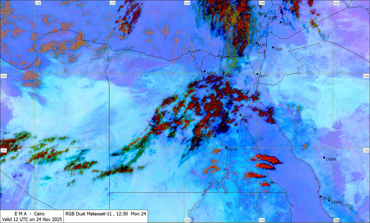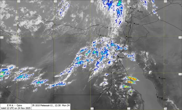 نشرت هيئة الأرصاد الجوية، صورا للأقمار الصناعية، وخرائط الطقس، تشير إلى تكاثر السحب الرعدية الممطرة على مناطق من جنوب سلاسل جبال البحر الأحمر وجنوب الصعيد يصاحبها فرص أمطار رعدية ومتفاوتة الشدة.