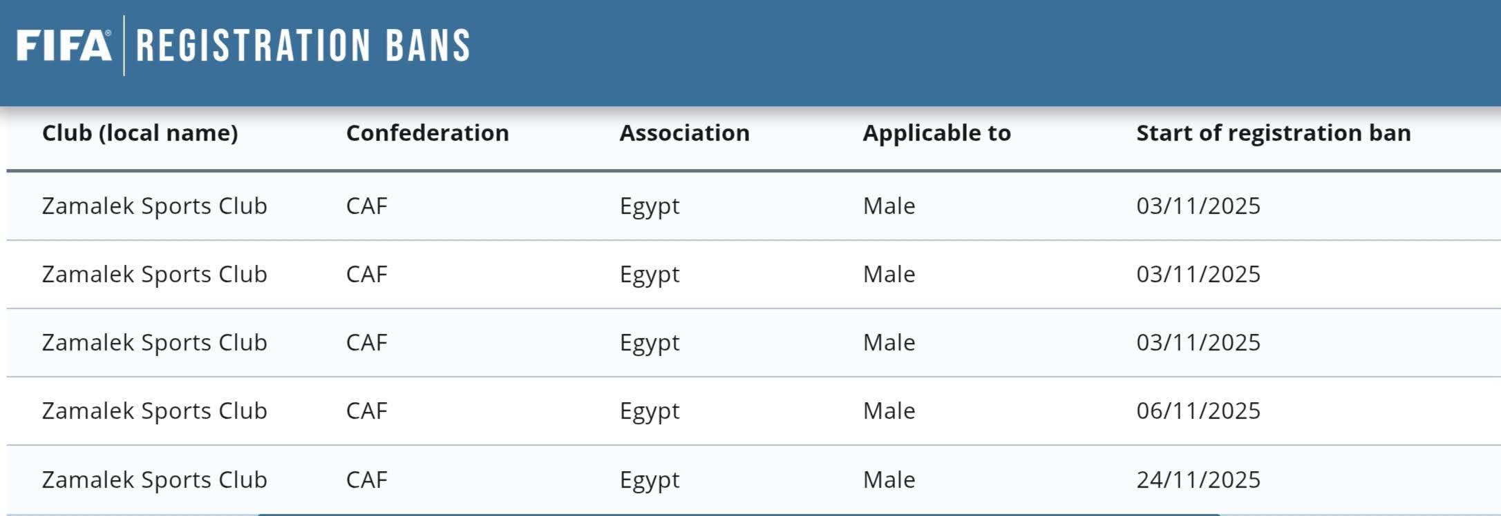 وقال عامر العمايرة، عبر الصفحة الرسمية بموقع التواصل الاجتماعي “فيسبوك”: "الأندية المصرية المعاقبة بحظر تسجيل لاعبين جدد من الفيفا هم: