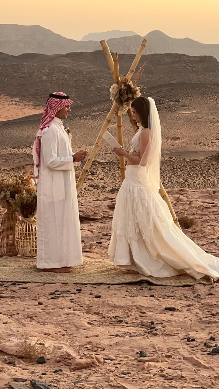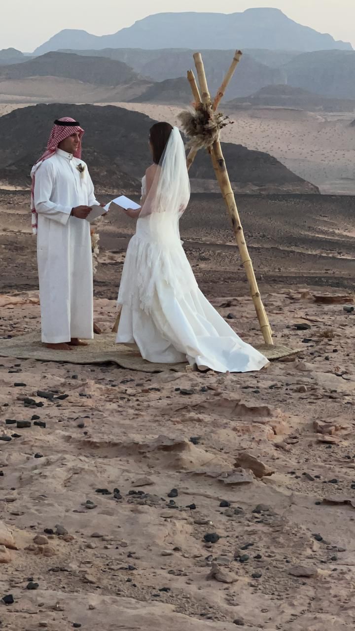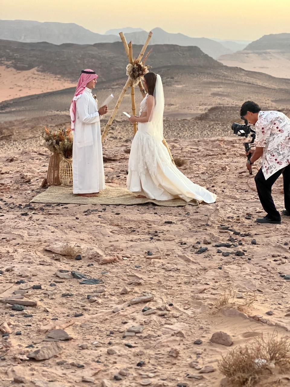 وقف العروسان أمام بعضهما على سجادة بدوية، تحيط بهما زينة من الخوص والزهور الجافة، بينما اكتفى الغروب والغيوم بدور الشهود على لحظة اتسمت بالسكينة والدفء.