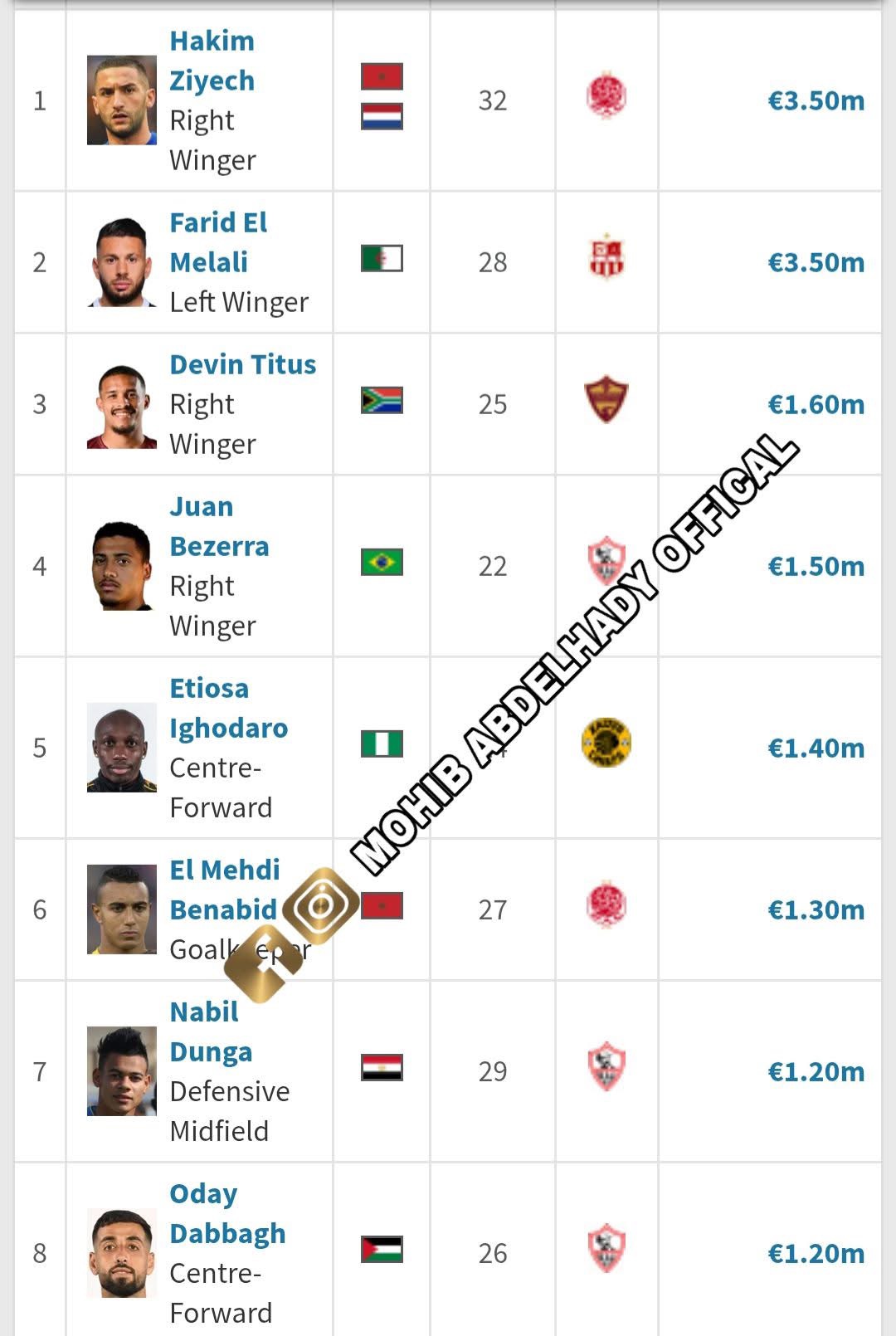 وكتب مهيب عبد الهادي عبر حسابه على موقع التواصل الاجتماعي فيسبوك :"أعلي8 لاعبين كقيمة تسويقية في بطولة الكونفدرالية ... علي رأس القائمة حكيم زياش نجم الوداد الجديد ... الزمالك يشارك بـ 3 لاعبين ".