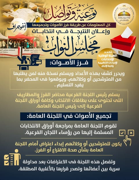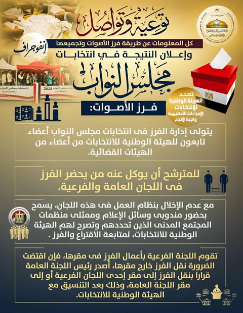 أصدرت وزارة الشؤون النيابية والقانونية والتواصل السياسي بيانًا اليوم الثلاثاء 25 نوفمبر 2025، قالت فيه إنه استمرارًا لسلسلة المحتوى التوعوي الذي بدأته الوزارة تحت شعار "توعية وتواصل"، نشرت اليوم مجموعة إنفوجرافات سياسية توعوية قدمت فيها معلومات بشأن كل ما يتعلق بعمليات فرز الأصوات، وذلك بالتزامن مع اليوم الثاني والأخير في انتخابات المرحلة الثانية، لـ مجلس النواب 2025.