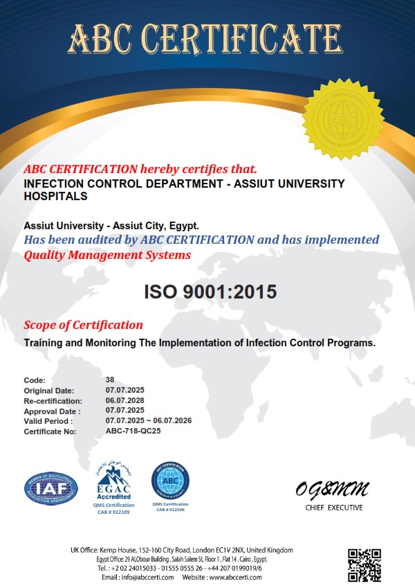 أعلن الدكتور أحمد المنشاوي، رئيس جامعة أسيوط، عن حصول إدارة مكافحة العدوى بالمستشفيات الجامعية على شهادة الجودة والاعتماد الدولي ISO 9001:2015، في إنجاز جديد يضاف إلى سلسلة النجاحات التي تحققها المدينة الطبية بالجامعة، ويعكس التزامها بتطبيق أحدث الممارسات العالمية في مجال مكافحة العدوى وتعزيز جودة الرعاية الصحية.
