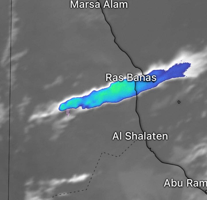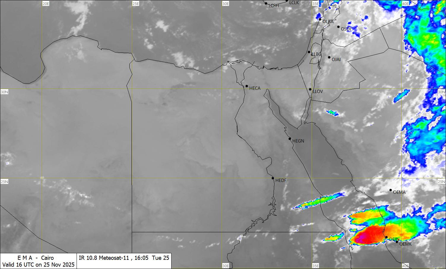 نشرت هيئة الأرصاد الجوية، صورًا للأقمار الصناعية وخرائط الطقس، تشير إلى استمرار تكاثر السحب الرعدية الممطرة على بعض المناطق من جنوب سلاسل جبال البحر الأحمر .
