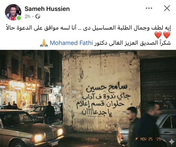 وكتب الفنان سامح حسين على الصورة قائلاً: «إيه لطف وجمال الطلبة العساسيـل دي... أنا لسه موافق على الدعوة حالًا، شكرًا للصديق العزيز الغالي الدكتور محمد فتحي.»
