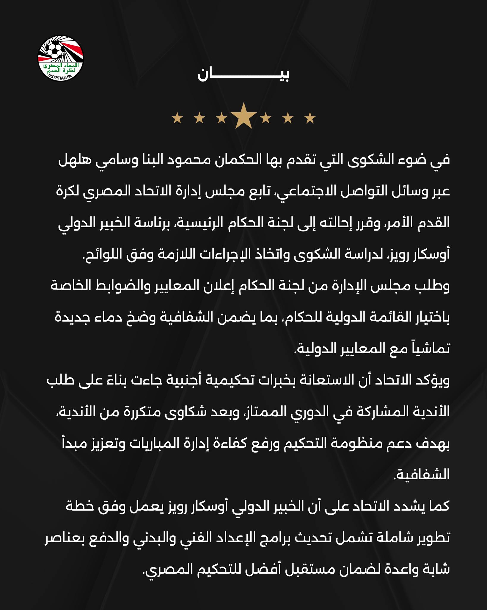 أصدر مجلس إدارة الاتحاد المصري لكرة القدم بيانًا رسميًا للرد على الشكاوى الأخيرة التي تقدم بها الحكمان محمود البنا وسامي هلهل عبر منصات التواصل الاجتماعي، والتي انتقدت منظومة التحكيم.