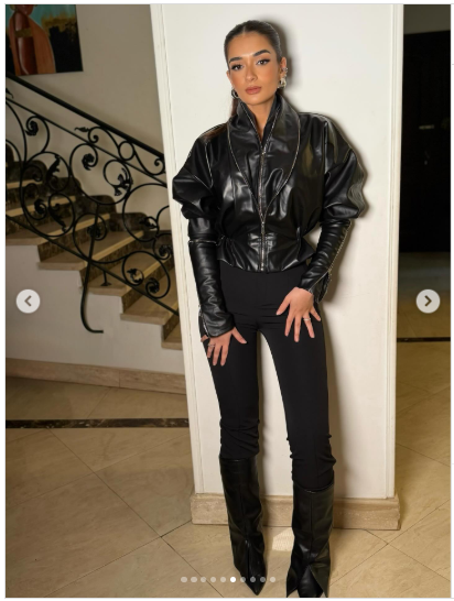تألقت ملك أحمد زاهر في الصور بإطلالة عصرية، حيث ارتدت بنطلون باللون الأسود مع جاكت جلد بنفس اللون مما كشف عن رشاقتها وقوامها المثالي.