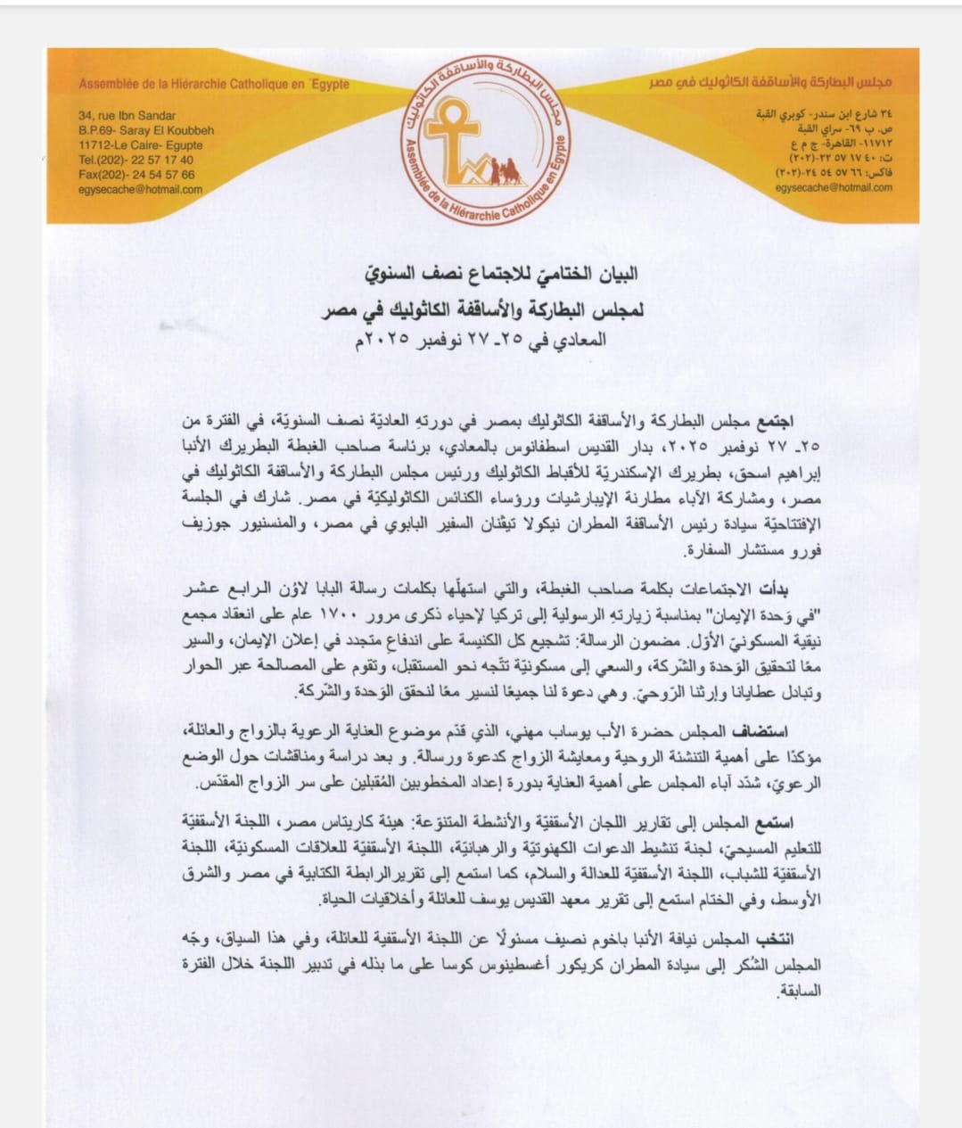 اجتمع مجلس البطاركة والأساقفة الكاثوليك بمصر في دورتهِ العادية نصف السنوية، في الفترة من 25 ـ 27 نوفمبر 2025، بدار القديس اسطفانوس بالمعادي، برئاسة صاحب الغبطة البطريرك الأنبا إبراهيم اسحق، بطريرك الإسكندرية للأقباط الكاثوليك ورئيس مجلس البطاركة والأساقفة الكاثوليك في مصر، ومشاركة الآباء مطارنة الإيبارشيات ورؤساء الكنائس الكاثوليكيّة في مصر.