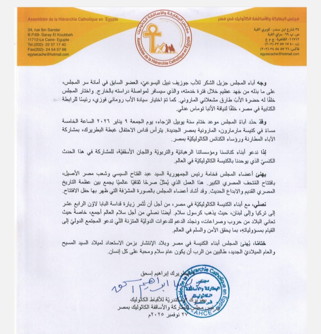 كما يهنئ المجلس أبناء الكنيسة في مصر وبلاد الانتشار بزمن الاستعداد لميلاد السيد المسيح والعام الميلاديّ الجديد، طالبين من الرب أن يكون عامَ سلام ومحبة على كل إنسان.