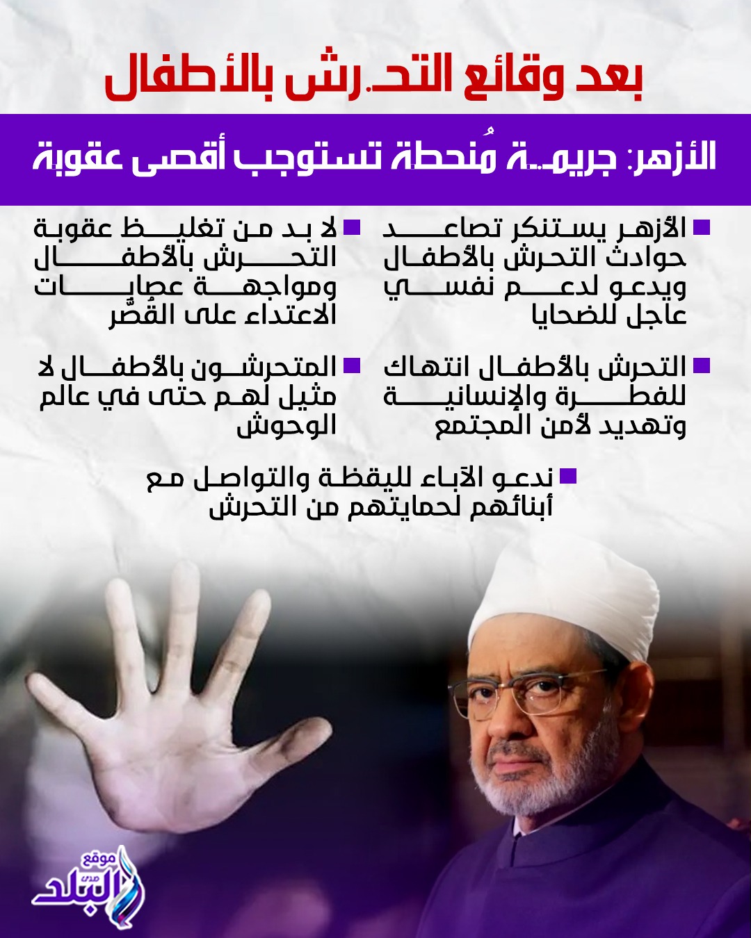 تابع الأزهر الشريف بقلقٍ بالغٍ وبحزن أليم ما تداولته الأنباء خلال الفترة الأخيرة من حوادث التحرش بأطفالنا الأبرياء وانتهاك حرماتهم والمساس بشرف عائلاتهم، على أيدي عصابات مجرمة تجرَّدت من كل معاني الرحمة والإنسانية، وضربت عرض الحائط بكل القيم الدينية والأخلاقية.
