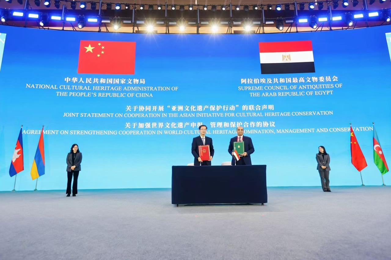 وفيما يتعلق بالبيان المشترك، وأوضح الأمين العام للمجلس الأعلى للآثار، إنه يأتي في إطار المبادرة الآسيوية للحفاظ على التراث الثقافي، وبموجب بنوده سيتم تعزيز تبادل الخبرات بما يحقق المنفعة المشتركة للحفاظ على الآثار والتراث، وترشيح مواقع التراث العالمي وإدارتها ومراقبتها، ودعم الجهود المشتركة في مواجهة الإتجار غير المشروع بالممتلكات الثقافية والجرائم المرتبطة به، وبناء شبكة تعاون لإستعادة واسترداد الممتلكات الثقافية بما يسهم في حماية التراث الثقافي المشترك للبشرية.