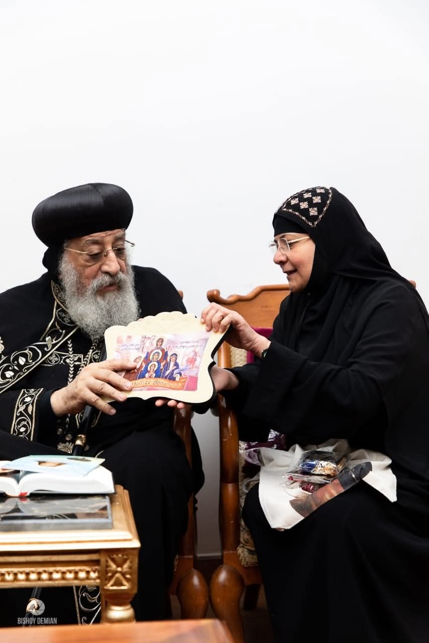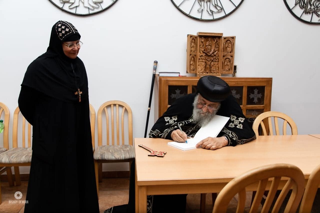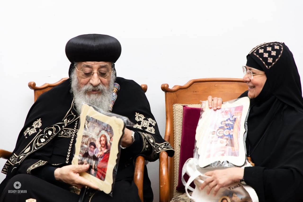 وصلى قداسته، لدى وصوله، صلاة الشكر في كنيسة الدير، ثم ألقى كلمة روحية للأمهات الراهبات، تناولت معاني الفرح فى حياة الراهبة، وأهمية النمو الروحي، كما أجاب قداسته على الأسئلة الروحية والرهبانية التي طرحتها الراهبات.
