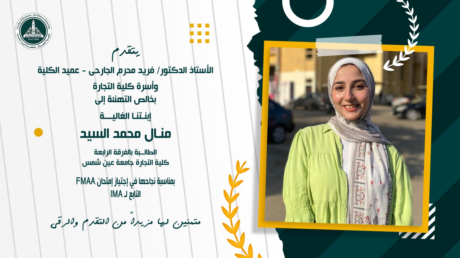 وتتقدم كلية التجارة بجامعة عين شمس بخالص التهنئة للطالبين المتفوقين، وتتمنى لهما دوام التوفيق والنجاح، وأن يكون هذا الإنجاز بداية لمستقبل مهني باهر، وحافزاً لبذل المزيد من الجهد لتحقيق الطموحات.