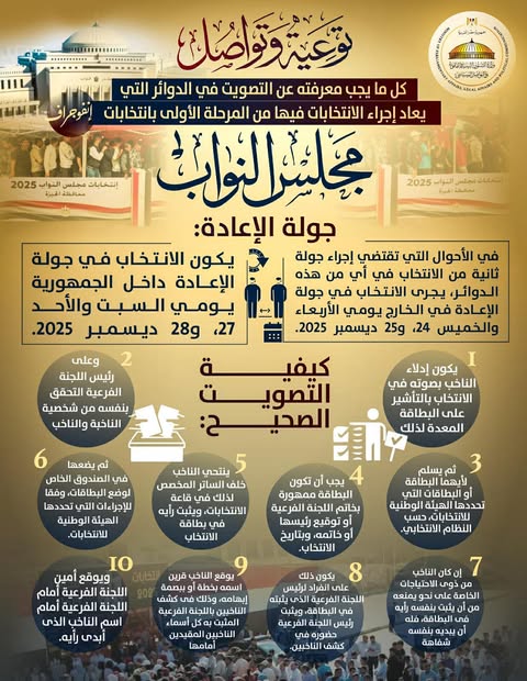 أصدرت وزارة الشؤون النيابية والقانونية والتواصل السياسي بيانًا اليوم الجمعة 28 نوفمبر 2025، قالت فيه إنه استمرارًا لسلسلة المحتوى التوعوي الذي بدأته الوزارة تحت شعار "توعية وتواصل"، نشرت اليوم مجموعة إنفوجرافات سياسية توعوية قدمت فيها معلومات بشأن كل ما يجب معرفته عن التصويت في الدوائر التي يعاد إجراء الانتخابات فيها من المرحلة الأولى بـ انتخابات مجلس النواب.
