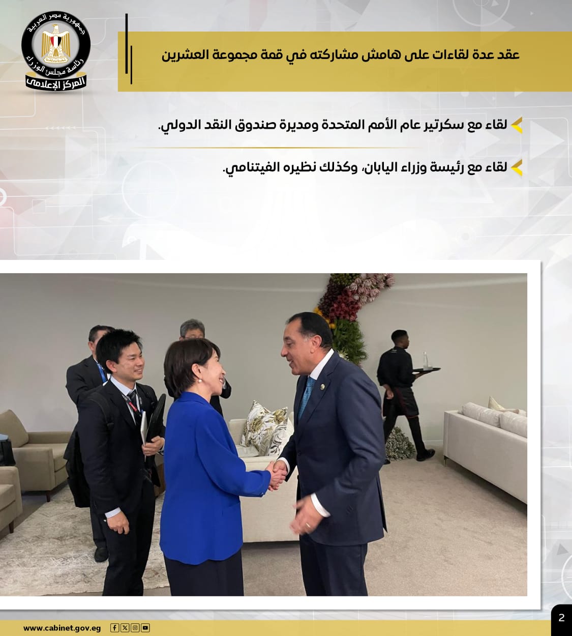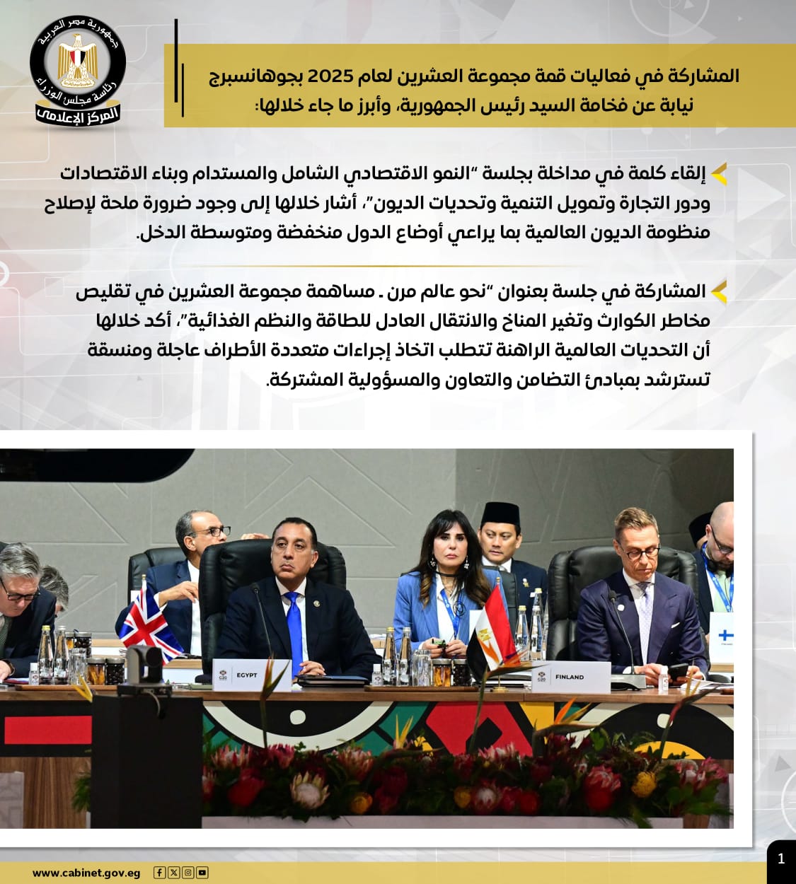 تضمنت الأنشطة، مشاركة رئيس الوزراء في فعاليات قمة مجموعة العشرين لعام 2025 بجوهانسبرج نيابة عن الرئيس، حيث أشار في كلمته إلى وجود ضرورة مُلحة لإصلاح منظومة الديون العالمية بما يراعي أوضاع الدول منخفضة ومتوسطة الدخل.