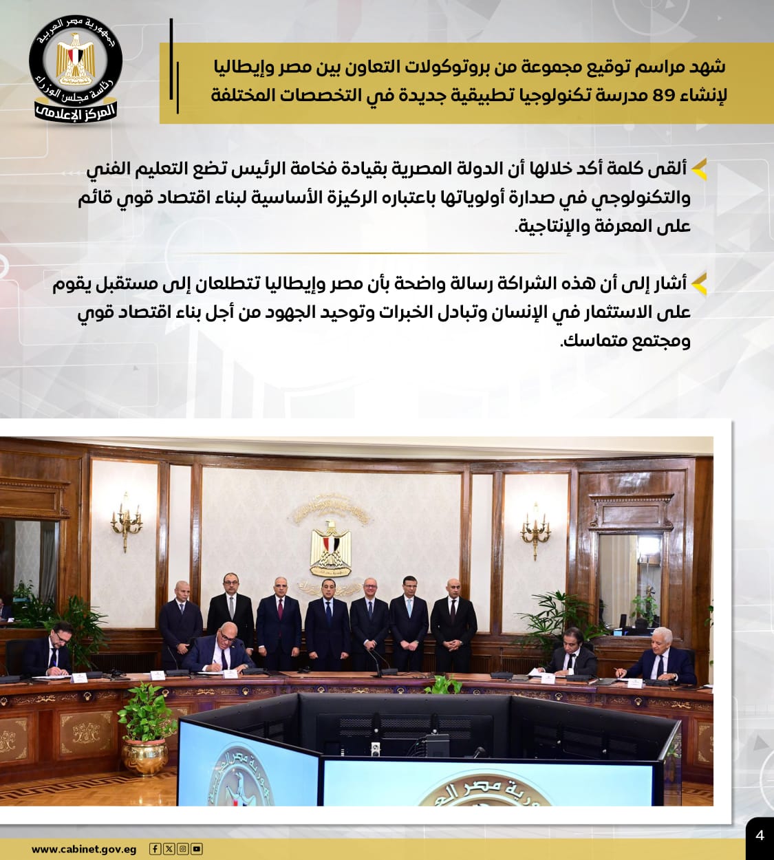 وشهد رئيس الوزراء مراسم توقيع مجموعة من بروتوكولات التعاون بين مصر وإيطاليا، لإنشاء 89 مدرسة تكنولوجيا تطبيقية جديدة في مختلف التخصصات، مؤكدًا أن الدولة بقيادة الرئيس تضع التعليم الفني والتكنولوجي في صدارة أولوياتها، باعتباره الركيزة الأساسية لبناء اقتصاد قوي قائم على المعرفة والإنتاجية.