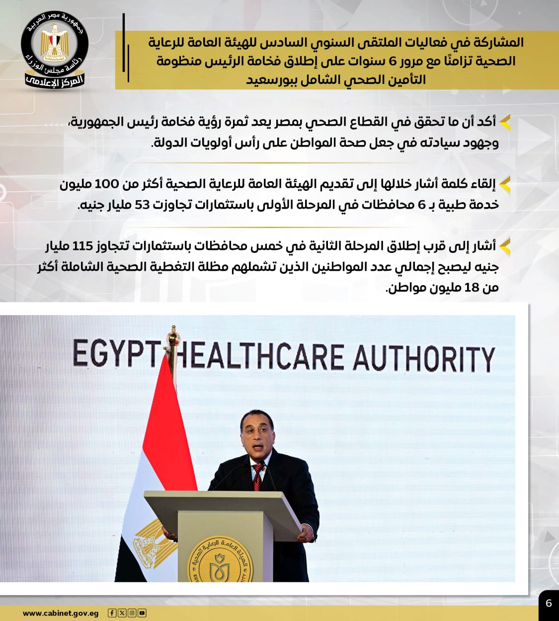 كما شارك رئيس الوزراء في فعاليات الملتقى السنوي السادس للهيئة العامة للرعاية الصحية، مؤكدًا أن ما تحقق في القطاع الصحي يعد ثمرة رؤية الرئيس وجهود في جعل صحة المواطن على رأس أولويات الدولة.