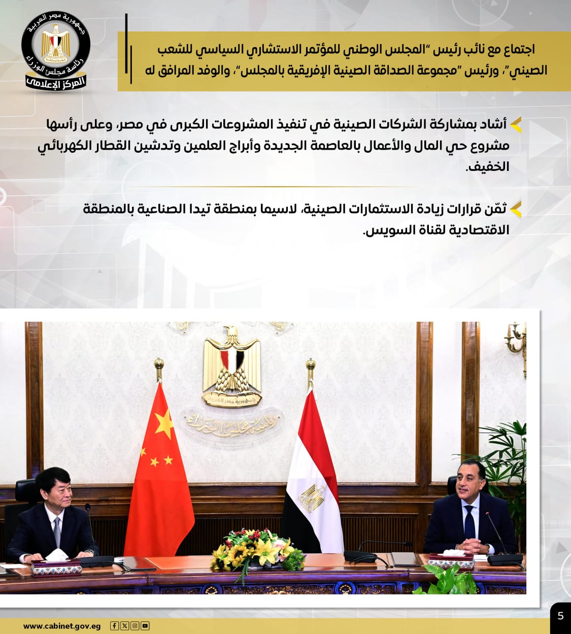 وفي السياق ذاته، عقد اجتماعًا مع نائب رئيس "المجلس الوطني للمؤتمر الاستشاري السياسي للشعب الصيني"، ورئيس "مجموعة الصداقة الصينية الإفريقية بالمجلس"، والوفد المرافق له، حيث أشاد بمشاركة الشركات الصينية في تنفيذ المشروعات الكبرى في مصر، كما ثمن قرارات زيادة الاستثمارات الصينية، لاسيما بمنطقة "تيدا" الصناعية بالمنطقة الاقتصادية لقناة السويس.