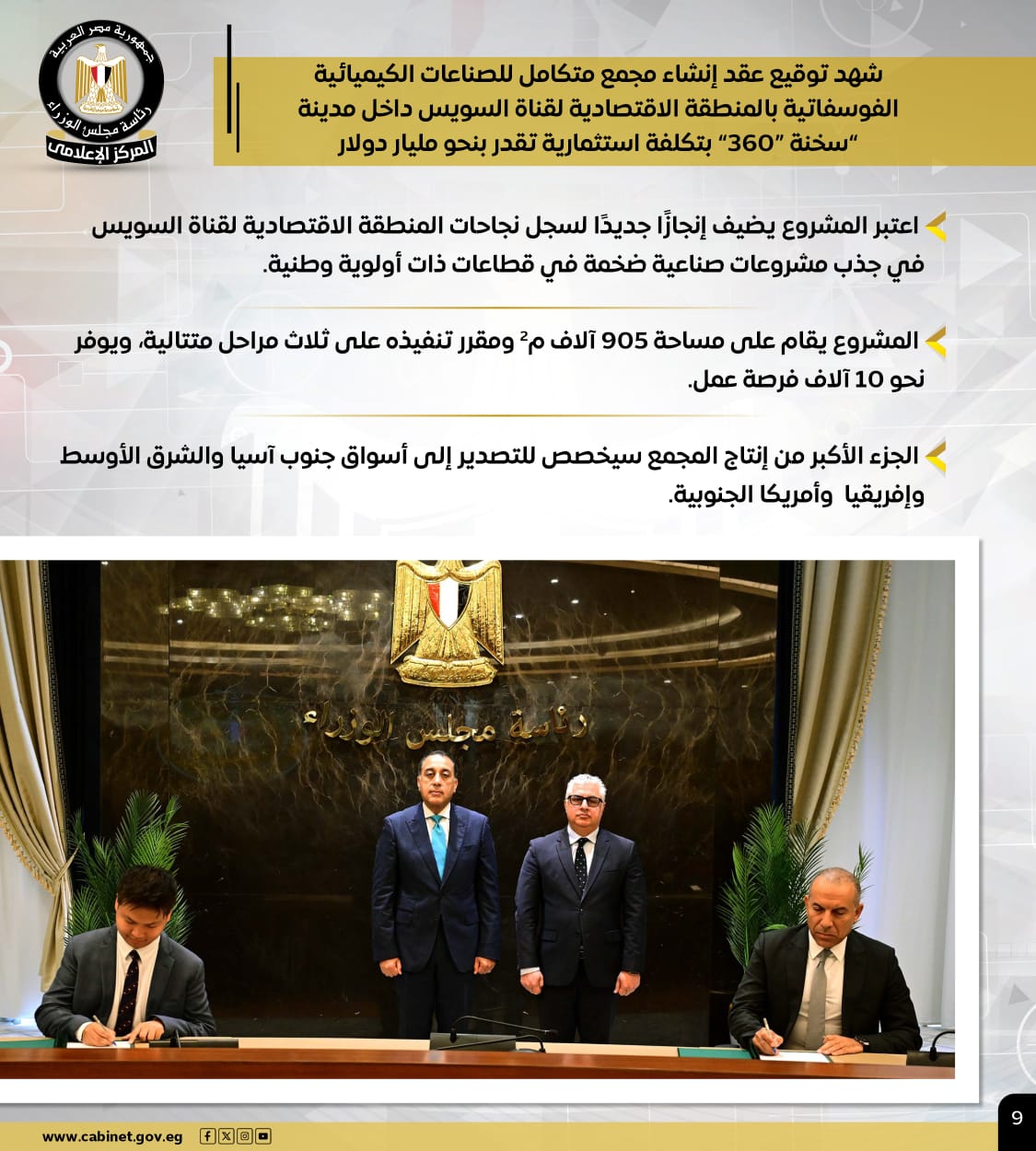 كما شهد توقيع عقد إنشاء مجمع متكامل للصناعات الكيميائية الفوسفاتية داخل مدينة "سخنة "360" بتكلفة استثمارية تقدر بنحو مليار دولار، على مساحة 905 آلاف م2 والمقرر تنفيذه على ثلاث مراحل متتالية، ويوفر نحو 10 آلاف فرصة عمل.